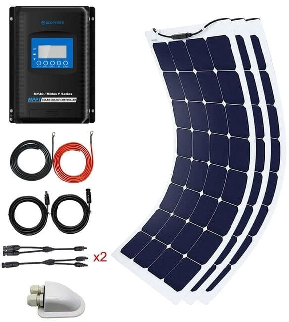 Our ACO Power 330 Watt Flexible Panel Solar Marine Kit combines high end components with flexible solar panel technology. Perfect for Marine and RV applications. This DIY Kit includes all of the solar accessories needed to get started: (3) 110 Watt Flexible Solar Panels, 40-Amp MPPT Solar Charge Controller and all of the cables and mounting brackets needed for installation.
