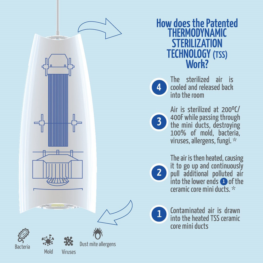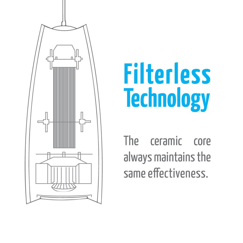 Air-sterilizing TSS ceramic core: 100% silent and maintenance-free, it destroys rather than holds mold and germs.