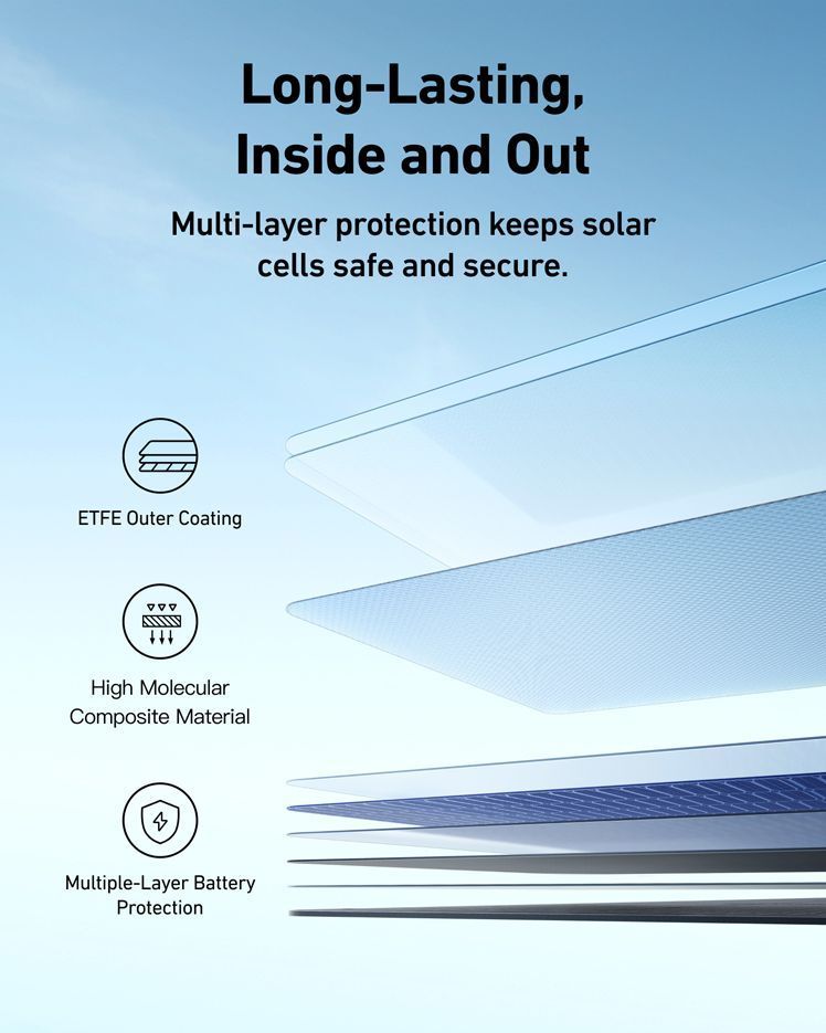 | • | Up to 23% Conversion Efficiency: You'll notice 1.5X faster charging times thanks to monocrystalline solar cells and a powerful sunlight-trapping surface. |