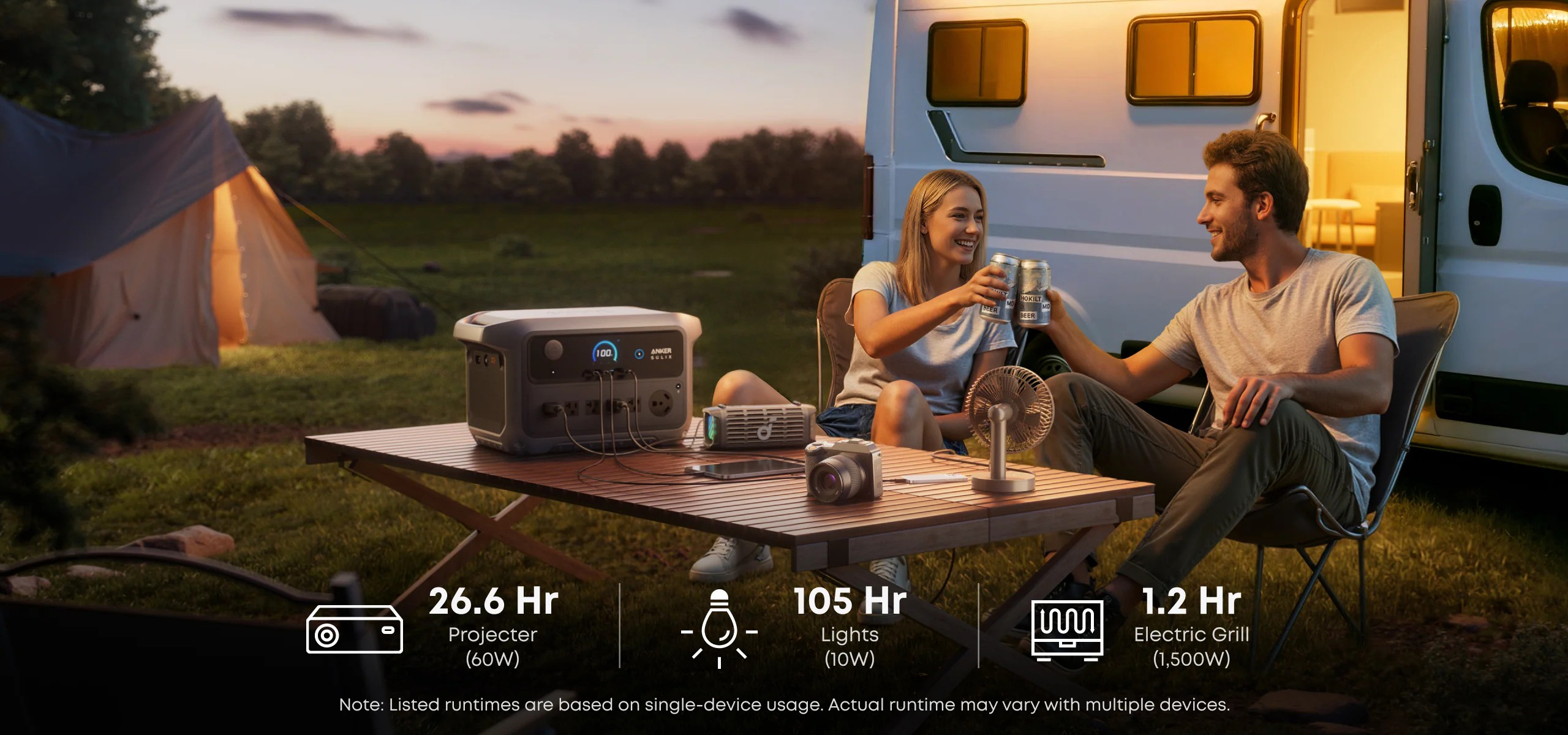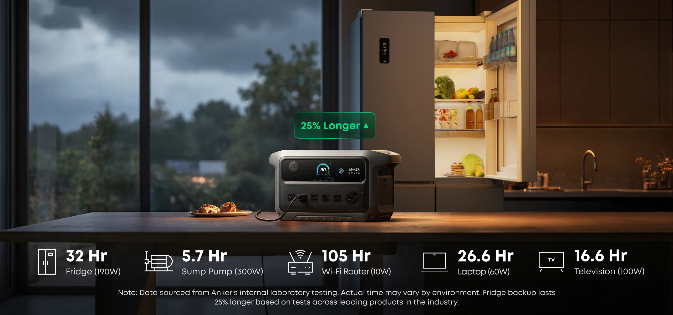 | • | Ultra-Efficient Power for Longer Runtime: Only 9W idle power consumption , powering a dual-door fridge for up to 32 hours. |
