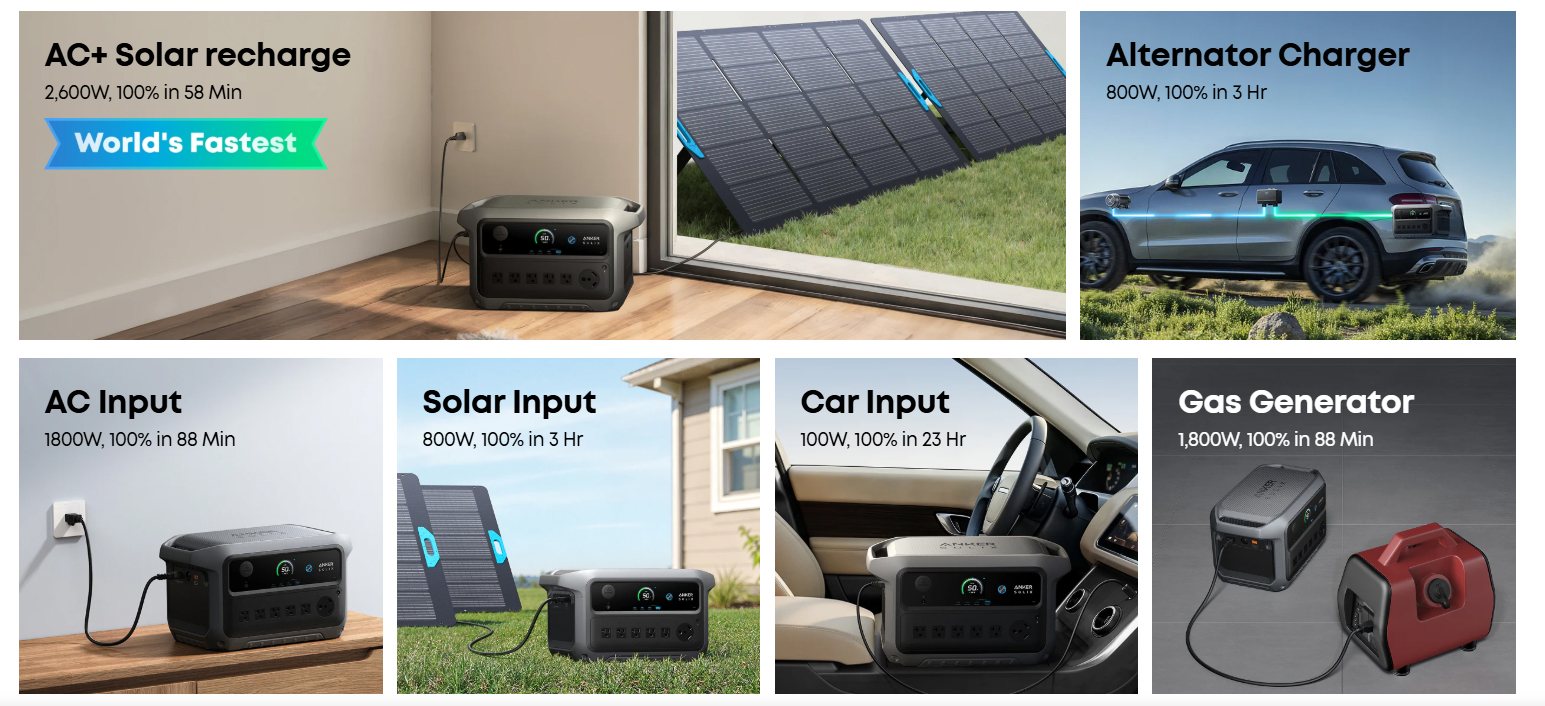 | • | Recharge On the Go with 800W UltraFast Alternator Charging: With 3-in-1 charging, you can charge up 8× faster than a standard car socket—100% in 3 hours. |
