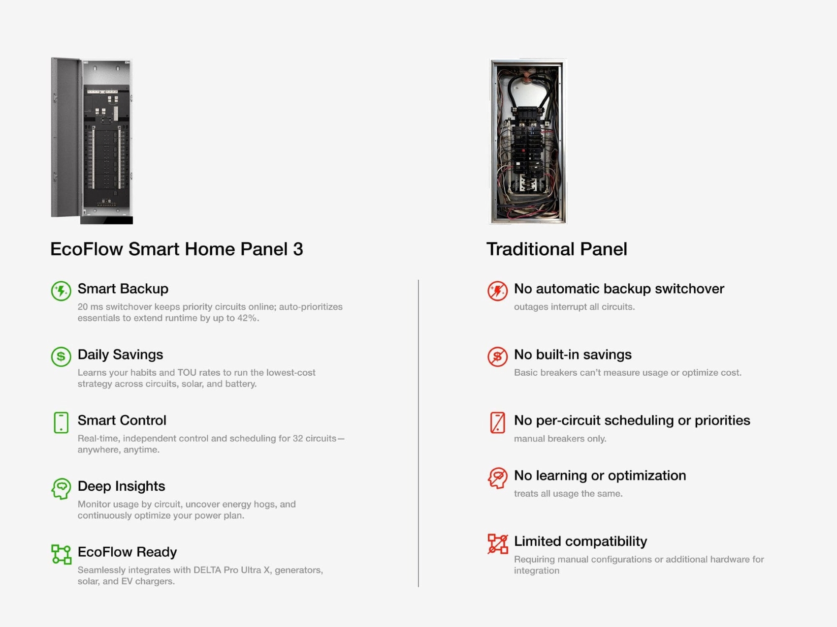 The EcoFlow Smart Home Panel 3 is an intelligent electrical panel featuring 32 independently controlled circuits. Fully compatible with DELTA Pro Ultra X, generators, solar panels, and EV chargers, it provides a seamless whole-home energy experience with instant, automatic backup during outages.