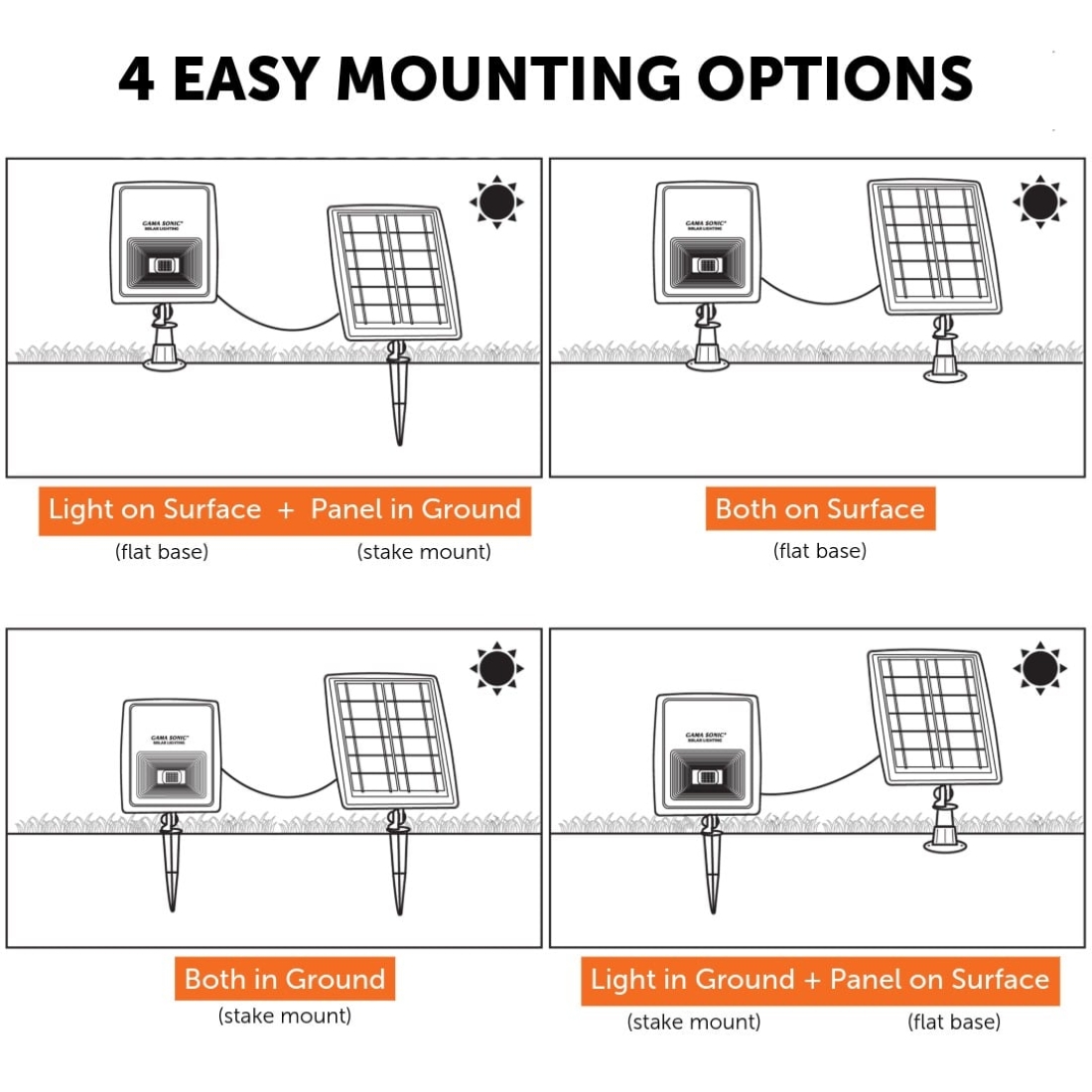 | • | Mounting Options: Includes 2 Ground Stakes and 1 Base Mount for perfect placement options. Easily mount Solar panel directly to the fixture or keep it separate for optimal sun exposure! |