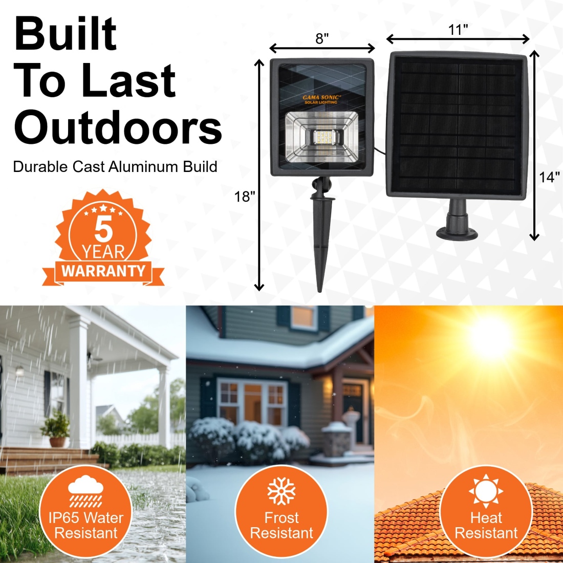 The Gama Sonic Pro Dual Color Solar Flood Light is a high-performance outdoor lighting solution that delivers up to 500 lumens of illumination with selectable warm white or bright white output to suit different environments. Designed for reliable operation it features a convenient brightness switch and automatic dusk to dawn functionality for hands free use. Its durable construction and weather resistant design make it ideal for demanding outdoor applications without the need for wiring or ongoing maintenance. This makes it an excellent choice for enhancing visibility and security while maintaining energy efficiency in any outdoor setting.