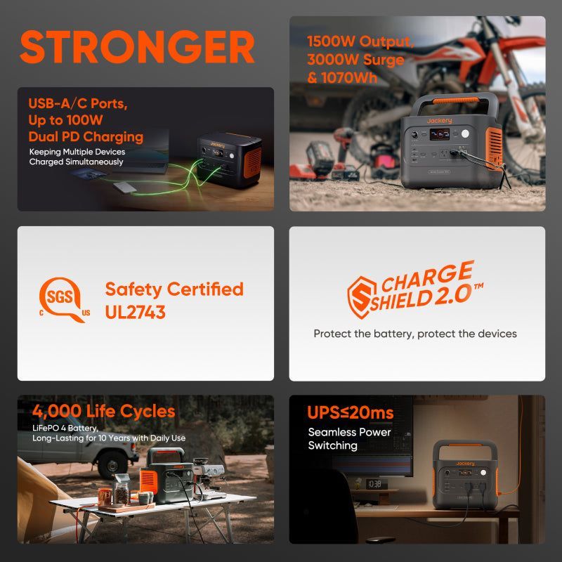 | • | Experience next-level safety with the Jackery 1000 v2 Portable Power Station. Featuring upgraded ChargeShield 2.0 technology, it offers diverse charging modes including fast charging, emergency super charging, and whisper-quiet charging. |