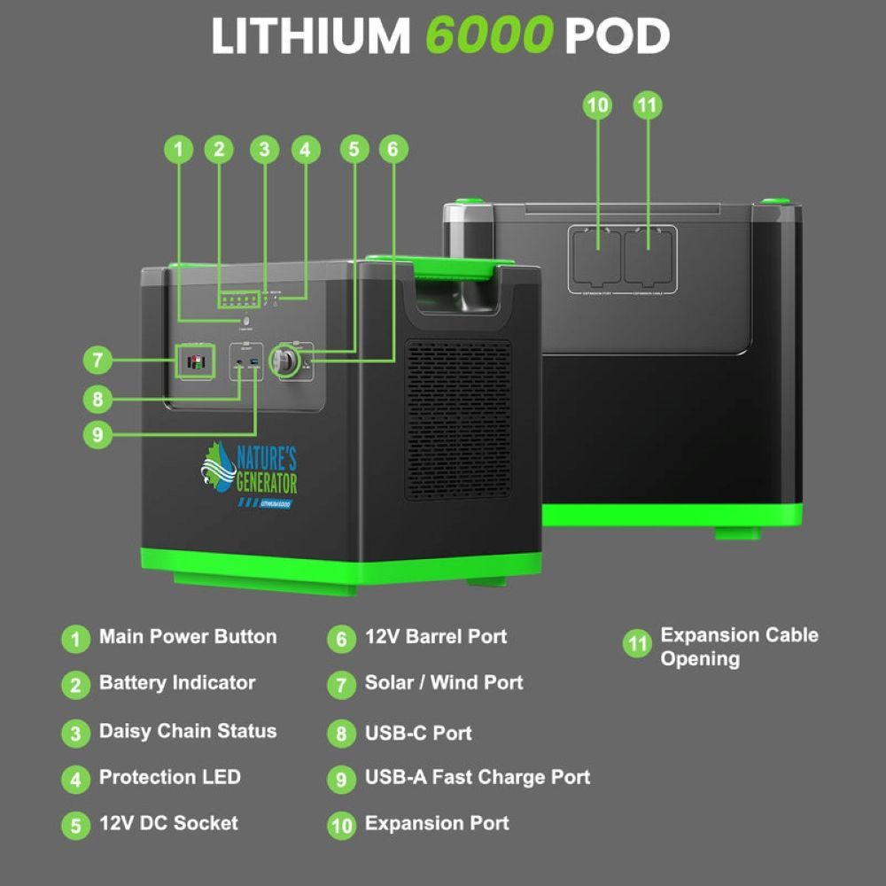 | • | Designed specifically to expand your storage with the Natures Generator Lithium 6000 Portable Power Station Pods! Click Here to add more pods! |
